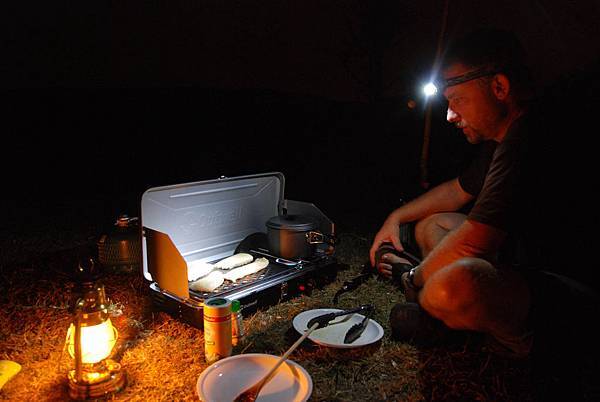 因為逛太晚才回營地,晚上摸黑吃火烤魚片,
