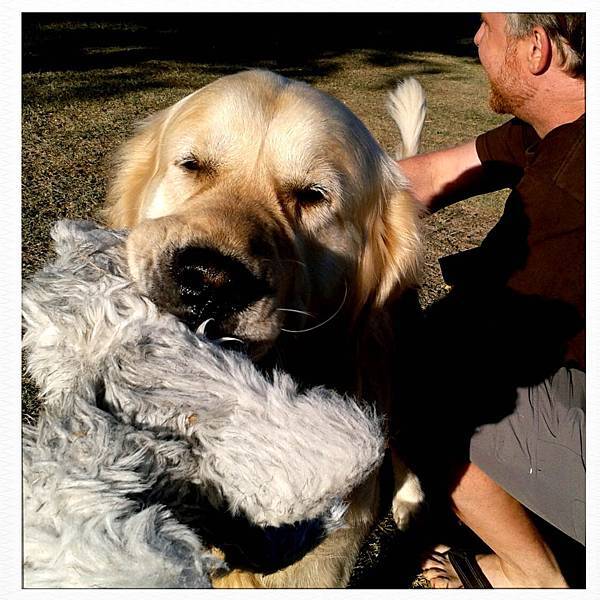就看到一隻超大的黄金獵犬,叼著玩偶從露營車內,直直地向我們衝過來,