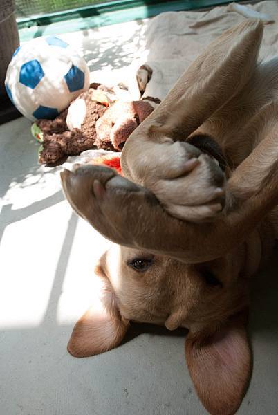 幼犬因為會亂跑,所以一直都是上著牽繩,